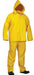 Bright Yellow Rain Suit Jacket with hood and stand up collar. Pants with bib front, fly with snap fasteners, adjustable sides, elastic suspenders and detachable hood. We also carry updated Lime 2 PC Rain Coat and pants.